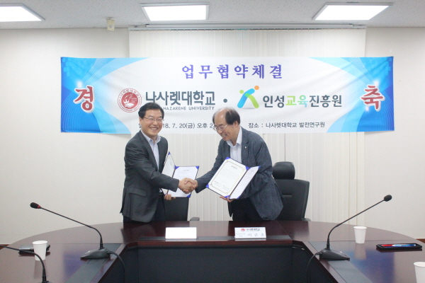 나사렛대학교 발전연구원(원장 이준호)과 인성교육진흥원(원장 김대의)는 지난 7월 20일 나사렛대학교 본관 대회의실에서 세계화 시대를 맞아 교육의 중요성을 공감하고 산, 학, 연이 연계하여 LET(Leader Effectiveness Training) 교육을 통한 사회기여를 목표로 업무협약을 체결했다.